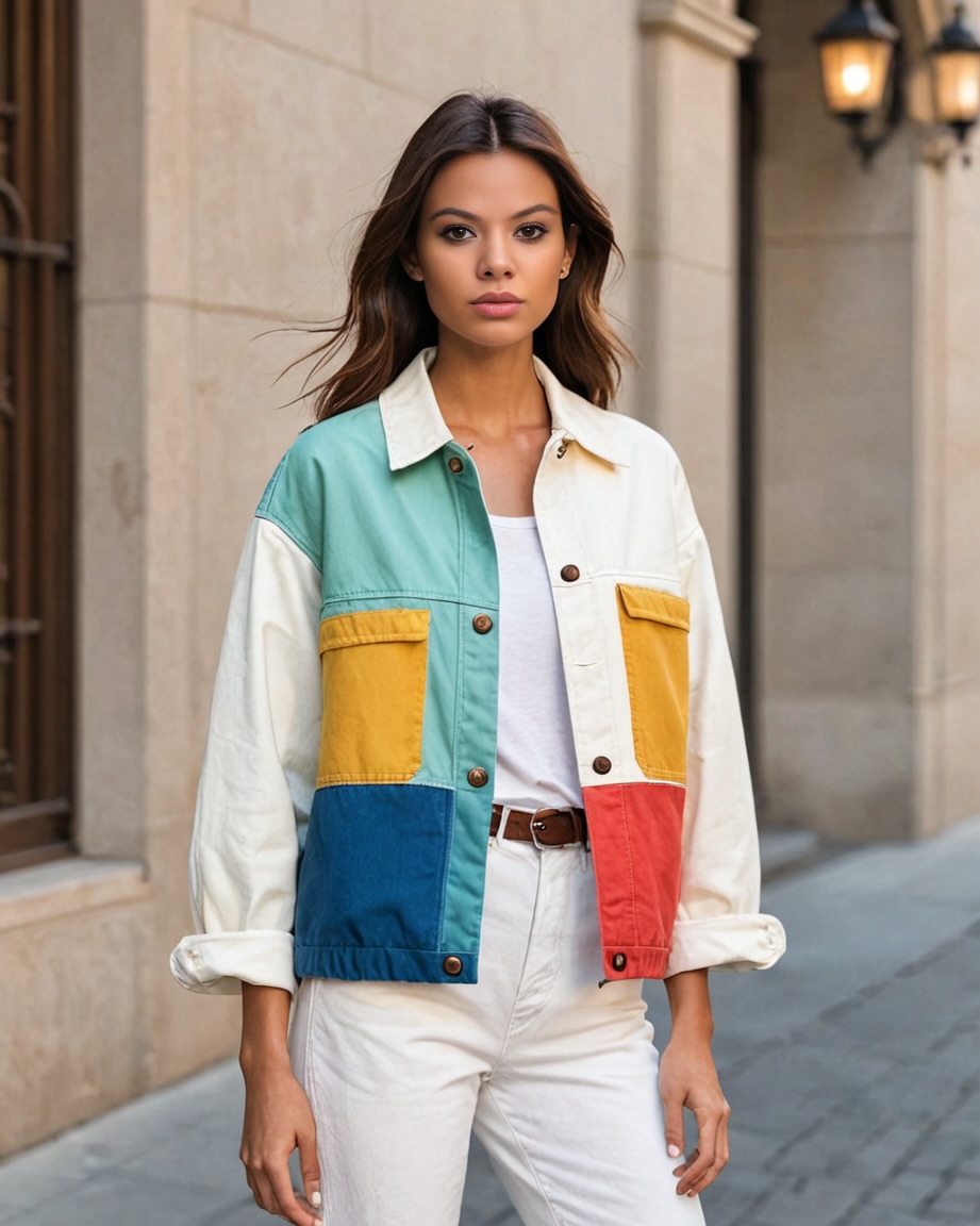 თეთრი ქურთუკი ფერადი დეტალებით