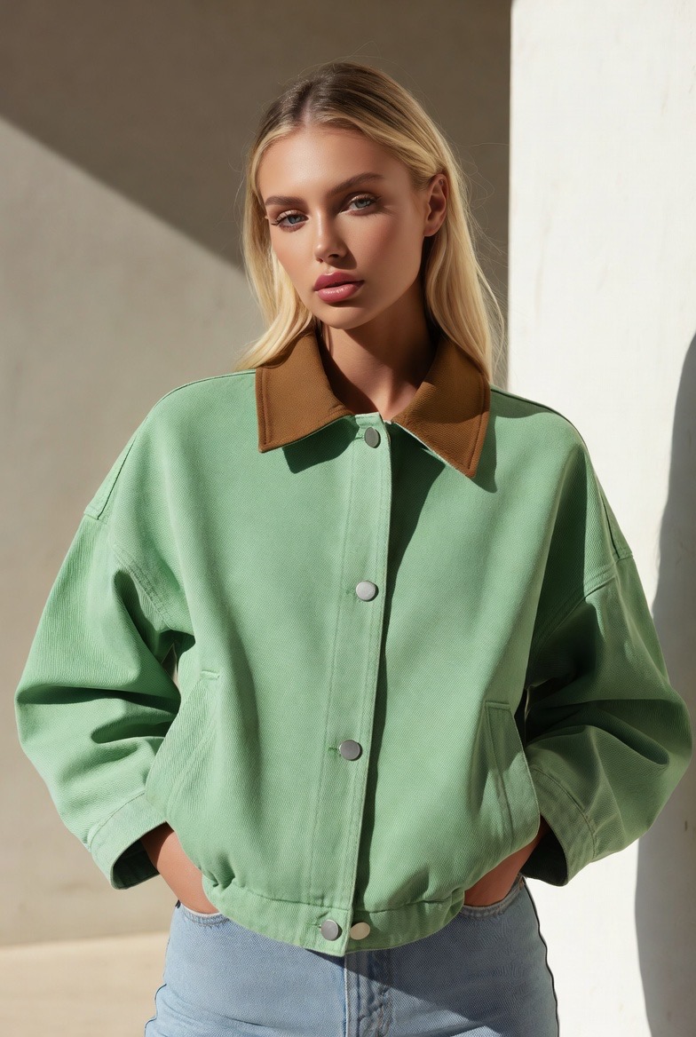 ღია მწვანე ქურთუკი ყავისფერი ტყავის საყელოთი